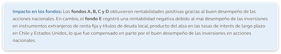 Enero fue un mes de retornos mixtos para los Multifondos, explicado principalmente por resultados positivos en renta variable nacional y negativos en renta fija, tanto nacional como extranjera. En este contexto, aquellos fondos con mayor exposición a renta variable -es decir, los fondos A y B- registraron mejores resultados que aquellos con una mayor proporción de instrumentos de renta fija, como los fondos D y E.