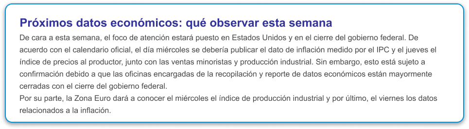 Lo que parecía una semana relativamente tranquila al menos a nivel de mercados (solo interferida en parte por el cierre del gobierno federal en Estados Unidos desde el 1 de octubre), y que recibía de buena forma los importantes avances alcanzados los últimos días hacia un proceso de paz en Medio Oriente por el conflicto que enfrenta a Israel y Palestina, terminó por nublarse algo el día viernes luego del recrudecimiento de las hostilidades comerciales entre los gobiernos de la principal economía del mundo y de China. Este nuevo capítulo en el enfrentamiento a nivel arancelario entre estadounidenses y chinos llevó a que las bolsas norteamericanas mostraran fuertes caídas el último día de la semana. Si bien posteriormente el presidente de Estados Unidos, Donald Trump, anunció un arancel del 100% a los productos chinos, cierta moderación en el lenguaje utilizado, momentos después, hizo repuntar fuertemente este lunes por la mañana a los futuros de los principales indicadores bursátiles de la principal economía del mundo. Lo anterior nos ha servido de recordatorio de que este no es un tema que se ha cerrado completamente, sino que puede seguir siendo fuente de volatilidad e incertidumbre en las próximas semanas, aunque también pareciera tratarse nuevamente de herramientas de negociación en un proceso que ya se ha dilatado por bastante tiempo.