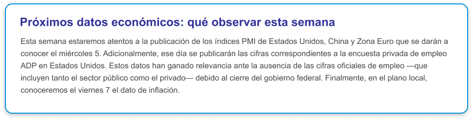 En primer lugar, se podría decir que esta reunión fue algo más compleja debido a la falta de cifras económicas producto del cierre del gobierno federal que afecta desde hace ya varios días a Estados Unidos. Dentro de las pocas cifras que se tenían a disposición, se contó con la inflación medida por el IPC y el resultado de encuestas privadas de creación de empleo, lo que obligó a la Fed a tomar decisiones con información limitada. En segundo lugar, la decisión no contó con la unanimidad de sus miembros, ya que uno de ellos se inclinó por un recorte de 50 pb, mientras que otro optó por mantener la tasa.