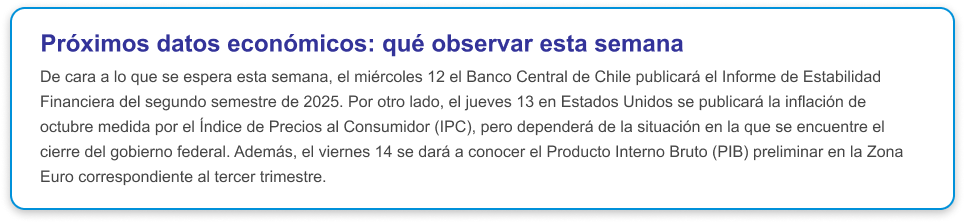 La semana pasada estuvo marcada por un incremento en la volatilidad a nivel de mercados, explicado principalmente por dudas sobre las valorizaciones que presentan las empresas estadounidenses, específicamente las que están relacionadas con inteligencia artificial. A comienzos de semana, algunos líderes de empresas financieras, tales como Goldman Sachs y Morgan Stanley, declararon que el mercado estadounidense podría enfrentar fuertes correcciones durante los próximos 12 a 24 meses, producto de las altas valorizaciones que reflejan las compañías que componen los principales índices bursátiles del país. Si bien señalaron que los fundamentos se mantenían sólidos y que algún retroceso sería saludable para que el mercado continuara con su ascenso, los dichos afectaron, al menos momentáneamente, el apetito por riesgo de los inversionistas.